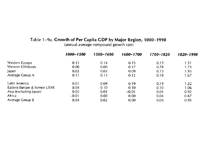 Share of World Product by Regions (%) 1000 1500 1820 1998 8, 7 17, 9 23, 6 20, 6 Western offshoots 0, 7 0, 5 1, 9 25, 1 Japan 2, 7 3, 1 3, 0 7, 7 Asia (excl. Japan) 67, 6 62, 1 56, 2 29, 5 Latin America 3, 9 2, 0 8, 7 EE + USSR 4, 6 5, 9 8, 8 5, 3 Africa 11, 8 7, 4 4, 5 3, 1 Western Europe