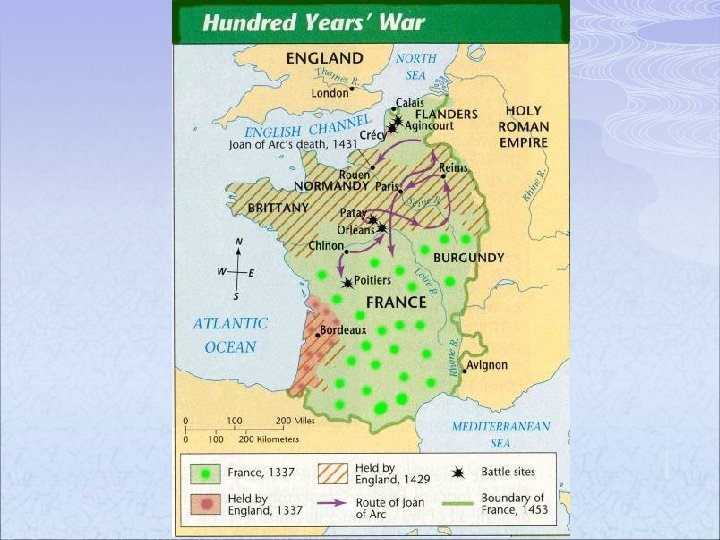 Hundred Years’ War p When the last French king in the direct Capetian line died in 1328 AD, the English king Edward III, who already held a large part of France, claimed the right to rule all of France - to be the king of France as well as the king of England. At this time Edward III was only eighteen years old. War broke out in 1338. At first the English won some big battles. But the war went on and on, even after Edward III died in 1377. Partly because of the Black Death, neither side could really end the war. Under their new young king Henry V, the English won a especially big battle at Agincourt in 1415, where Henry used a new weapon, cannons, to help him win the battle.