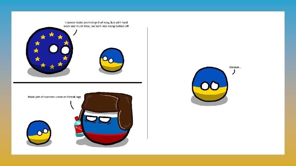 EU policy versus Russian policy EU Russia • Cooperation based on EU values • Association agreement, DCFTA, visa free regime, financial aid • Ukraine as a part of the ”Russian world”: language, history, media, religion ( empire) • Post-Soviet, authoritarian, undeveloped, corrupted… • From soft power to hard power (2014) • at least 16. 5 billion EUR in 20142020 • No membership perspective ( colonialism? )