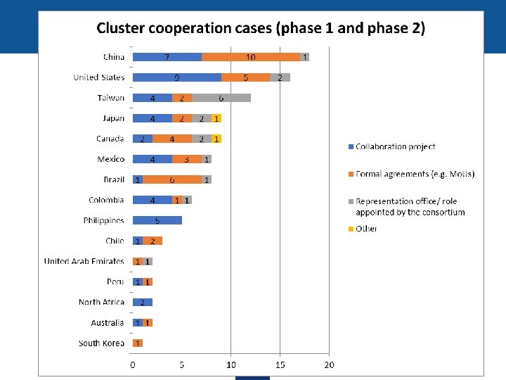 European Strategic Cluster Partnerships for internationalisation Promoting cluster cooperation for industrial leadership in global markets • 25 projects • 123 cluster organisations (25 projects) representing over 17, 000 SMEs • Supporting joint international strategies and collaboration with partners in third countries for the benefit of SMEs Nb of partners involved per country in this action 0 1 -3 4 -6 7 -9 10+ http: //www. clustercollaboration. eu/escp-list