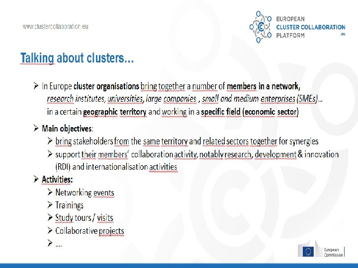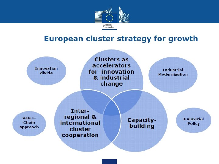 European Cluster Policy Forum Dialogue among EU Member States, European Commission & experts about modern cluster policies Synergies between cluster initiatives and industrial, innovation and regional policies, especially in relation to smart specialisation, SMEs scaling-up and cross-sectoral collaboration Using clusters in supporting entrepreneurship and the scaling-up of SMEs Cluster internationalisation – using cluster partnerships to help clusters and their members go international Cluster excellence capacity-building & professionalisation of cluster management (incl. mobility for cluster managers)