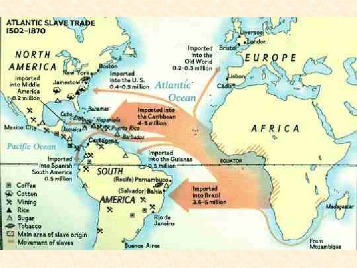 Triangle Trade System Tobacco, cotton, sugar & molasses is traded for guns & ammo. Slaves were traded for raw materials: things such as tobacco, cotton, sugar & molasses Lasted for 300 years Tribute – Reward System Manufactured goods such as guns & ammo were traded for slaves.