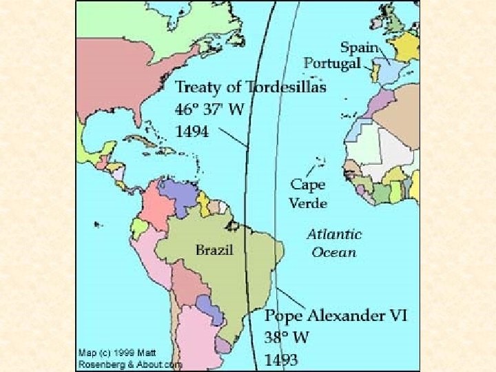 The Impact on Europeans $ Greed $ Political & Economic Competition Glory On May 4, 1493 Pope Alexander VI took action to clear up any confusion that may have arisen over territorial claims. He issued a decree which established an imaginary line running north and south through the mid-Atlantic, 100 leagues (480 km) from the Cape Verde islands. Spain would have possession of any unclaimed territories to the west of the line and Portugal would have possession of any unclaimed territory to the east of the line. After further exploration, the Portuguese grew dissatisfied with the agreement when they realized how much more land Spain had been given. In June of 1494 the line was re-negotiated and the agreement was officially ratified during a meeting in the Spanish town of Tordesillas. The Treaty of Tordesillas re-established the line 370 leagues (1, 770 km) west of the Cape Verde Islands. The largest voluntary migration in world history