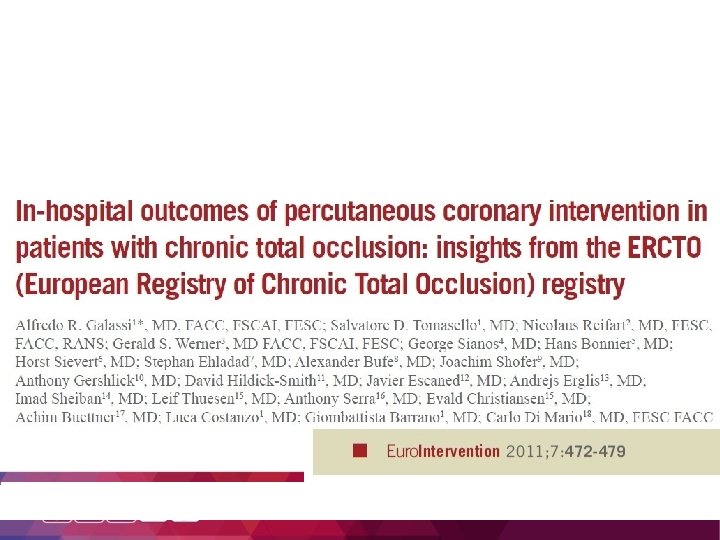 European Registry of CTO (ERCTO) v a prospective real-world registry that includes patients with one or more CTO lesions in major coronary arteries or saphenous vein grafts v 44 centers across Europe v all patients undergoing CTO PCI at these centers between January 2008 and June 2015 were registered prospectively using a web-based electronic data collection interface (17, 626 percutaneous revascularization procedures) v no exclusion criteria v the treatment indication was symptomatic myocardial ischemia and/or evidence of reversible myocardial ischemia by perfusion imaging or stress testing, as proposed at the Euro. CTO Club’s position paper v procedural details (demographic data, techniques applied, equipment used, fluoroscopy, complication rate) were prospectively recorded