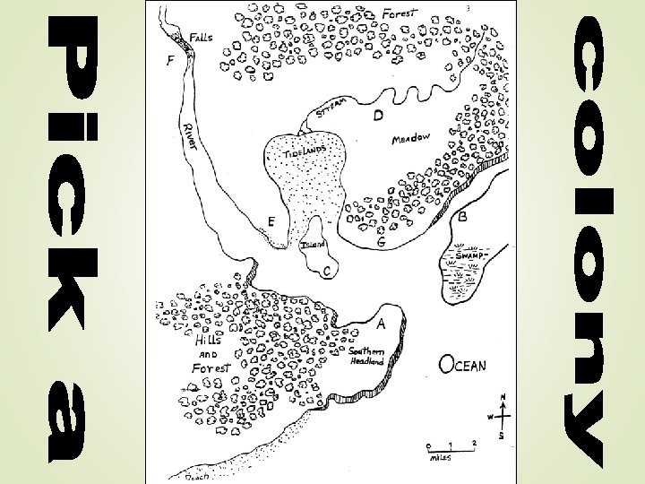 PICK A COLONY! It is 1607 – 13 years before the Pilgrims landed at Plymouth Rock in Massachusetts. You are part of a group of investors started by King James I to support and expand the British empire. You are with 105 other passengers on the The Susan Constant, and left 12 weeks ago to head to the New World. You have experienced sickness, hunger, exhaustion, and witnessed the burial of too many at sea. But you have hope…desire…for a new life, in a new place, a place where you will be POWERFUL. Alas! You are now anchored at a very unfamiliar location and a landing party has come back with a map with possible settlement locations. You set off with your group in hopes that your spot is the chosen settlement. Explore the positives (and negatives) of your location and come up with a persuasive pitch to give the other settlers to convince them why your spot, this previously unknown spot is the new location of the 1 st successful British colony…and your home.