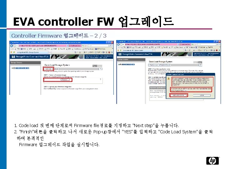 EVA controller FW 업그레이드 Controller Firmware 업그레이드 – 1 / 3 Controller FW Disk FW 1. Storage 등록정보의 “Version”에서 Controller Firmware버전 정보를 확인하고 “Code load”메뉴를 클릭 합니다. 2. Controller Firmware는 “Code Load Storage System”를 선택하고 “Select”를 눌러 업그레이드를 진행합 니다. * Notes : SBM의 CVEVA로 접속할 경우, Disk Firmware는 “Code Load Disk Drives Online”을 선택해서 진 행할 수 있지만, ABM 즉, EVA 4400의 MM의 CVEVA로 접속한 상태에서는 Disk Firmware upgrade선택부