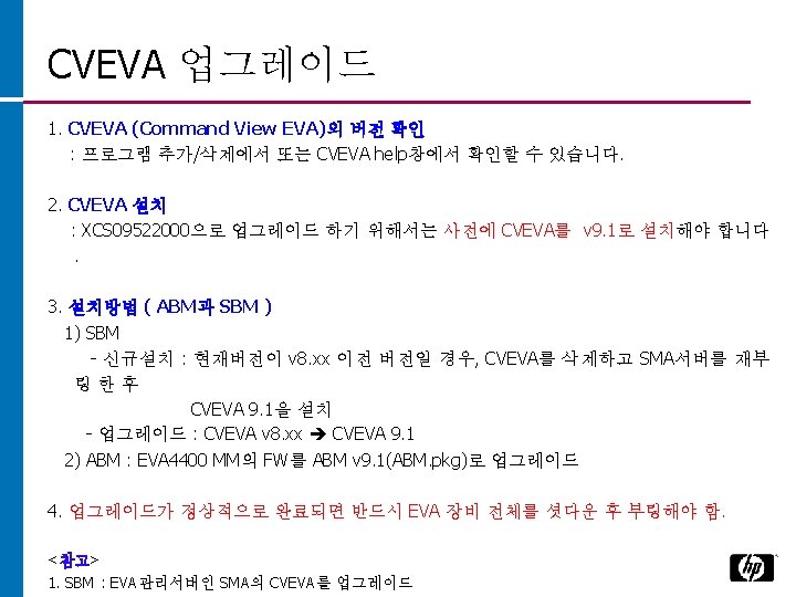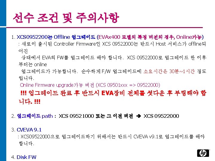 목차 - 선수조건 - CVEVA 업그레이드 - EVA 4400 MM의 FW 업그레이드 - EVA Controller & Disk FW 업그레이드 - EVA FW관련 Local known issues - Case Coding Guide - Useful URLs