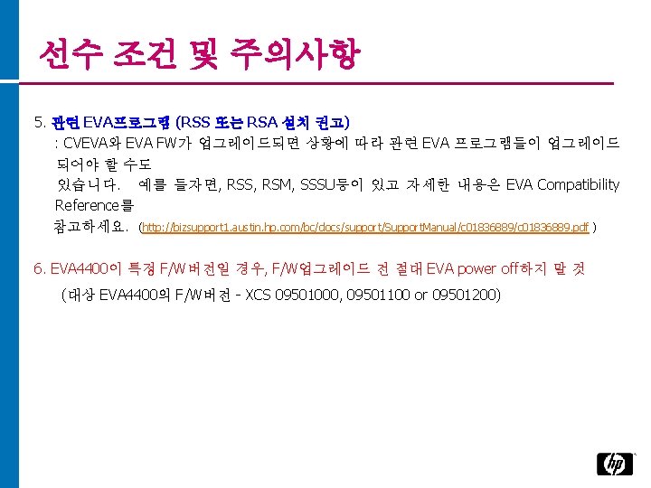 Useful URLs 1. EVA 4400, 6400, 8400 FW download http: //hpswest. corp. hp. com/VCSUpgrade. Program. asp http: //ftp. hprc. co. kr/index. php? pathext=_HSJ/ https: //h 20392. www 2. hp. com/portal/swdepot/display. Product. Info. do? product. Number=T 4256 -63129 2. HP Storage. Works Command View EVA 9. 1 (ABM and SBM) http: //h 20392. www 2. hp. com/portal/swdepot/display. Products. List. do? category=SWSDED 3. EVA HD bundle FW image download http: //h 20000. www 2. hp. com/bizsupport/Tech. Support/Software. Index. jsp? lang=en&cc=us&prod. Name. Id=3351789&prod Type. Id=329290&prod. Series. Id=3302267&sw. Lang=13&task. Id=135&sw. Env. OID=54 3. XCS 09522000 Release Notes http: //bizsupport 1. austin. hp. com/bc/docs/support/Support. Manual/c 01849456. pdf 4. Command View EVA Installation Guide http: //bizsupport 1. austin. hp. com/bc/docs/support/Support. Manual/c 01800876. pdf 5. HP Storage. Works Enterprise Virtual Array upgrading disk drive firmware read me first http: //h 20000. www 2. hp. com/bizsupport/Tech. Support/Document. Index. jsp? content. Type=Support. Manual&lang=en&cc= us&doc. Index. Id=64179&task. Id=101&prod. Type. Id=12169&prod. Series. Id=3664763#1