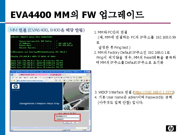 EVA 4400 MM의 FW 업그레이드 MM 접속 방법 (EVA 6400, 8400은 해당 안됨) MM의 WOCP & CVEVA 접속방법 - MM의 CVEVA 접속 => https: //192. 168. 0. 1: 2372 - MM의 WOCP 접속 => https: //192. 168. 0. 1: 2373 MM의 참고사항 - EVA 4400 Management Module의 기본 IP 주소는 192. 168. 0. 1이며 필요에 따라 Reset 버튼 으로 IP 주소 초기화가 가능합니다. - Management Module의 IP는 WOCP로 접속하여 변경가능하고, WOCP로 접속이 안될 때는 Management Module의 Reset 버튼을 5초 정도 눌렀다 떼면 Default IP로 변경됨 - SBM과 MM(=ABM)을 동시에 사용하는 경우, SBM의 Command View EVA버전과 MM의 Firmware를 적정버전으로 유지해야 합니다. 즉, MM의 CVEVA와 SBM의 CVEVA버전이 동일 버전 계열이어야 하고 아래 URL에서 다운로드 할 수 있습니다. (예, HP Storage. Works Command View EVA 9. 1 (ABM and SBM) with Replication Solutions Manager 5. 0) http: //h 20392. www 2. hp. com/portal/swdepot/display. Products. List. do? category=SWSDED