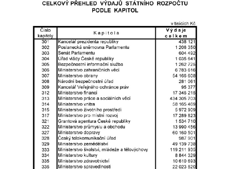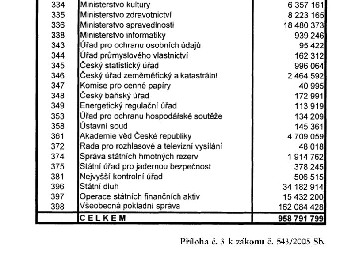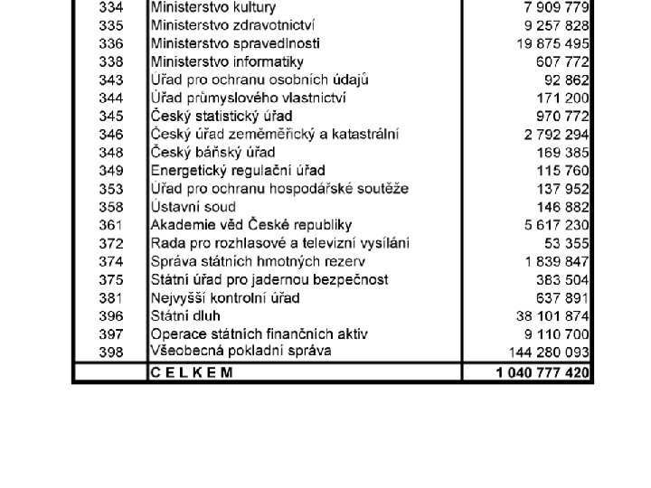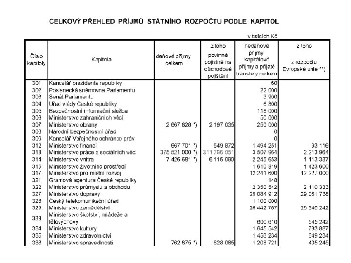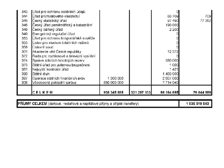 Státní rozpočet l l l vyrovnaný přebytkový schodkový Prohlubování deficitu: Příjmy Výdaje stagnují rostou pomaleji než výdaje klesají rychleji než výdaje rostou rychleji než příjmy rostou klesají pomaleji než příjmy