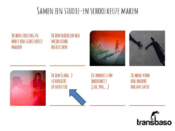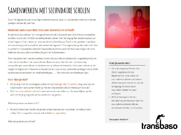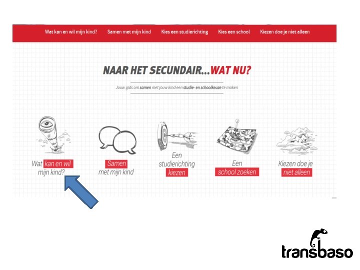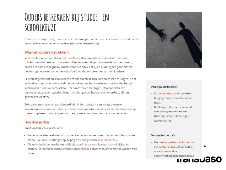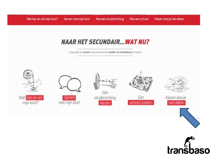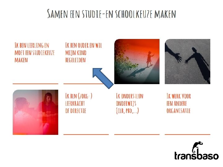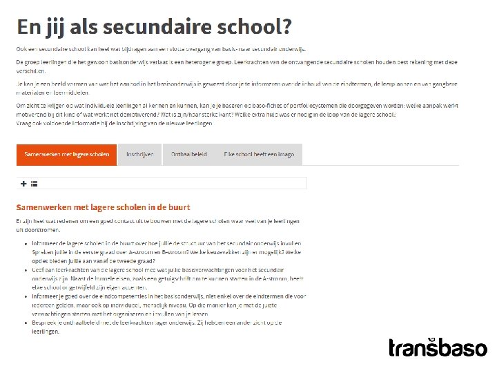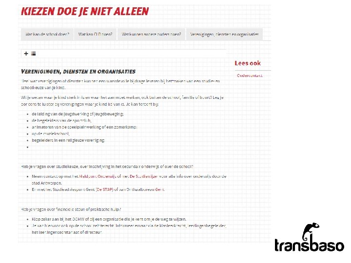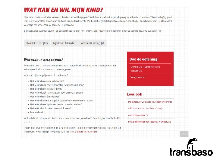 Transbaso • Actie-onderzoek rond school- en studiekeuze bij de overgang van basis- naar secundair onderwijs in Antwerpen en Gent. • Onderzoek & praktijk Diepgaand bestuderen van processen van schoolen studiekeuze. Ontwikkelen van instrumenten voor gebruikers (=actoren betrokken bij school- en studiekeuze) & ondersteuning in scholen.