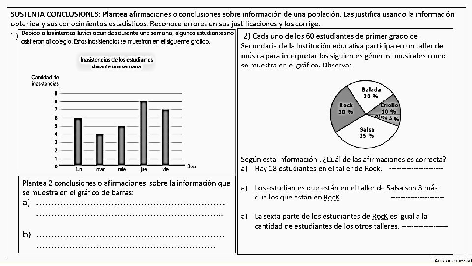 EVALUACIÓN 2 - GRÁFICOS ESTADISTICOS-MEDIDAS DE TENDENCIA CENTRAL ALUMNO(A): ……………………………PRIMERO : ………. . FECHA: ……… USA ESTRATEGIAS: Emplea procedimientos y recursos para procesar, organizar en tablas, representar en gráficos, determinar la mediana y la moda de datos discretos, en situaciones del contexto con el propósito de analizarlos y producir información. 1) La familia Balarezo, tiene 6 hijos, 3 son trillizos, 2 son mellizos y el menor tiene 7 años. Al calcular la media, mediana y moda resultan 14, 15 y 17 respectivamente. a. Hallar la diferencia entre la mayor y menor edad. b. Halla la edad de los mellizos.