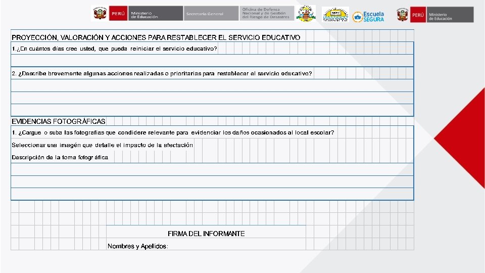 INFORMACIÓN INICIAL: Código. Local: Gestión: Insitutución Educativa Región: Nivel / Modalidad: Latitud: Provincia Distrito Inicial ( ), Primaria ( ), Secundaria ( ), CEBA ( ), CEBE ( ), CETPRO ( ) Longitud: En esta sección del Formulario EDANSE se consigna datos de la institución educativa afectada, ubicación, modalidad, etc.