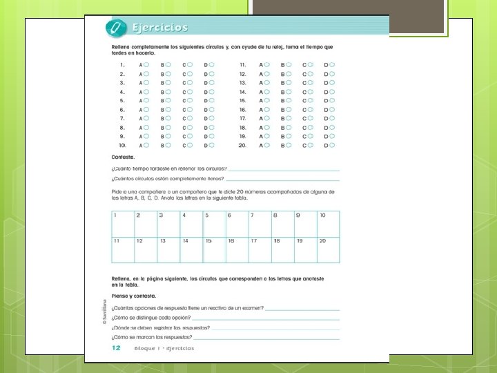 Un ejemplo de los reactivos de matemáticas de la prueba ENLACE 2007 6° grado. 15. La maestra de Matemáticas anotó los siguientes números en el pizarrón: 111 001, _____, 110 100, _____, 101 011, ______, 100 001. Si cuatro de sus alumnos pasan al frente y anotan sobre las líneas algunos números, de tal forma que todos queden ordenados de mayor a menor, ¿cuál de ellos lo hizo correctamente? A) Pedro: 110, 101 111, 100 101 B) María: 111 010, 110 011, 101 000 C) Sofía: 110 111, 110 101, 100 010 D) Juan: 110 111, 110 011, 101 111