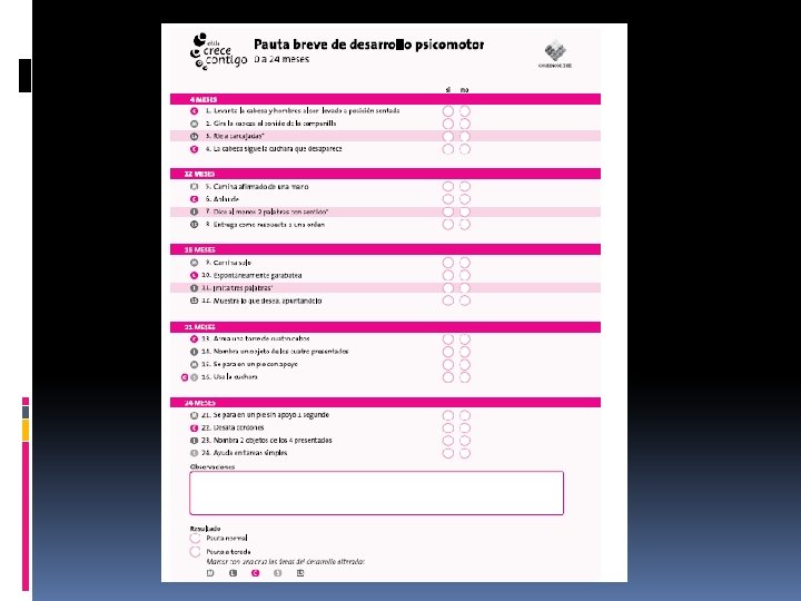 Hitos del desarrollo RN: Tono muscular y postura flexora, reflejos arcaicos presentes y simétricos, levanta la mejilla en posición prona 1 mes: Fija la mirada en el examinador y sigue a 90 grados, alerta al sonido, se sobresalta, vocaliza en suspensión ventral y mantiene cabeza a nivel del tronco 2 meses: Sonríe en respuesta al examinador, vocaliza, levanta cabeza por varios segundos en posición prona, mantiene manos empuñadas gran parte del tiempo, se sobresalta con sonidos fuertes 3 meses: Abre sus manos y las observa con atención, mantiene levantada la cabeza en prono, sigue objetos en plano vertical y horizontal, observa los rostros, afirma por segundos un objeto puesto en su mano, incorpora sonido de consonante "g' (agú) 4 meses: Se ríe fuerte, a carcajadas, mantiene la cabeza firme al mantenerlo sentado, alcanza un objeto, lo coge con la palma y lo lleva a la boca, gira la cabeza en busca del sonido, se sonríe espontáneamente 5 -6 meses En supino levanta la cabeza e intenta sentarse en prono, levanta cabeza y tronco y se gira a supino, manotea objetos, los agarra y transfiere de una mano a la otra, balbucea y localiza el origen del sonido, se sienta con apoyo y mantiene el tronco firme 7 -8 meses Se mantiene sentado solo, apoyando sus manos adelante (trípode), apoya su peso en los pies y flecta sus piernas con energía, golpea fuertemente objetos contra la mesa, los lleva a la boca, se gira de supino a prono e intenta gatear, dice disílabos (da-da, ba-ba), estira los brazos para ser tomado Se sienta solo por largo rato, sin ningún apoyo, se pone de pie afirmado de muebles, hace adiós con la mano, aplaude, como con los dedos, desconoce a extraños, dice "papa" o mama", busca el objeto caído (permanencia del objeto) 9 -10 meses: 11 -12 meses: Camina con poco apoyo, usa pinza fina índice pulgar, dice 3 -4 palabras con significado, gatea bien, ayuda al vestirse, comprende órdenes simples 13 -15 meses: Camina sin apoyo, se agacha en cuclillas, dice varias palabras (mucha jerigonza), hace rayas con un lápiz, apunta con el índice para pedir lo que necesita 18 meses Sube las escaleras gateando con ayuda, se sube a una silla, ayuda a desvestirse, comienza a comer solo, hace torre de 4 cubos, tira una pelota, apunta a 3 partes de su cuerpo, pide cosas por el nombre, dice varias palabras en forma incorrecta 24 meses: Sube y baja escaleras de pie solo (ambos pies en un peldaño), corre e intenta saltar con los dos pies juntos, se comunica diciendo 2 o 3 palabras formando frases simples, hace torre de 6 cubos, patea una pelota, dice su nombre