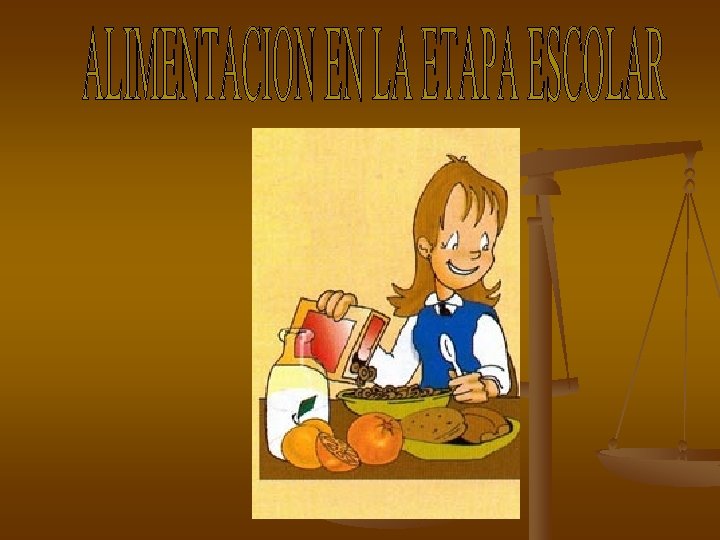 ALIMENTACIÓN SALUDABLE n n Lo ideal es que el niño coma una variedad y cantidad de alimentos para crecer saludable y responder a las responsabilidades que le impone la edad escolar. Para ello necesita una adecuada proporción de proteínas, hidratos de carbono, lípidos, hierro, calcio, vitaminas, etc. Estos elementos se encuentran en la variedad de alimentos que nos ofrece la naturaleza: leche y sus derivados, carnes rojas, pollo y pescado, verduras frescas y cocidas, frutas, cereales, legumbres, etc. Por último, será necesario combinar los gustos propios de cada niño con la habilidad de quien prepara los alimentos, de manera que él pueda recibir con placer aún aquellos alimentos que no son de su preferencia.