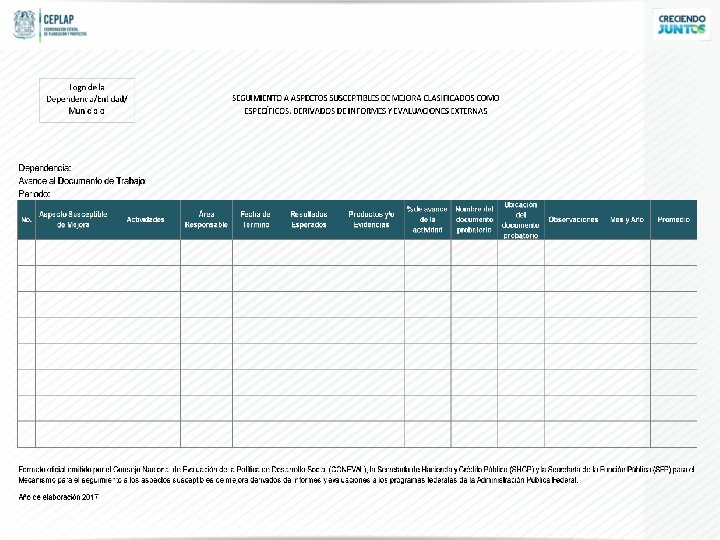 3. Elaborar el documento en el que se identifique la contribución del Programa a las metas y estrategias estatales y nacionales, así como integrar la vinculación con los Objetivos de Desarrollo Sostenible (OSD). 4. Elaborar la Matriz de Indicadores para Resultados (MIR) y la Ficha de Indicador de Desempeño (FID) a nivel municipal, basándose en la MIR Nacional. 5. Crear los mecanismos para dar seguimiento a la ejecución de las obras y acciones del Programa. 6. Crear los mecanismos de transparencia y rendición de cuentas. 7. Operar y dar seguimiento al programa de trabajo de los Aspectos Susceptibles de Mejora (ASM).