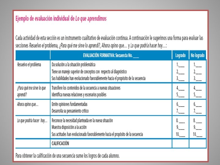 Instrumentos de evaluación Evaluación continua Q Sección “Lo que aprendimos” Q Portafolios Q Escala de estimación o estimativa Q Listas de cotejo Evaluación bimestral #Proyecto de investigación #Batería de reactivos