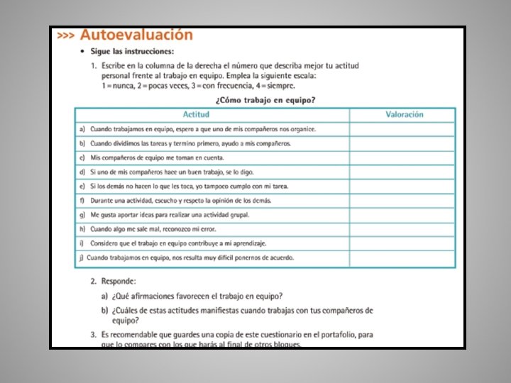 Escala estimativa • Tiene la función de hacer participar al alumno, reflexionando sobre su propio proceso de aprendizaje (autoevaluación).
