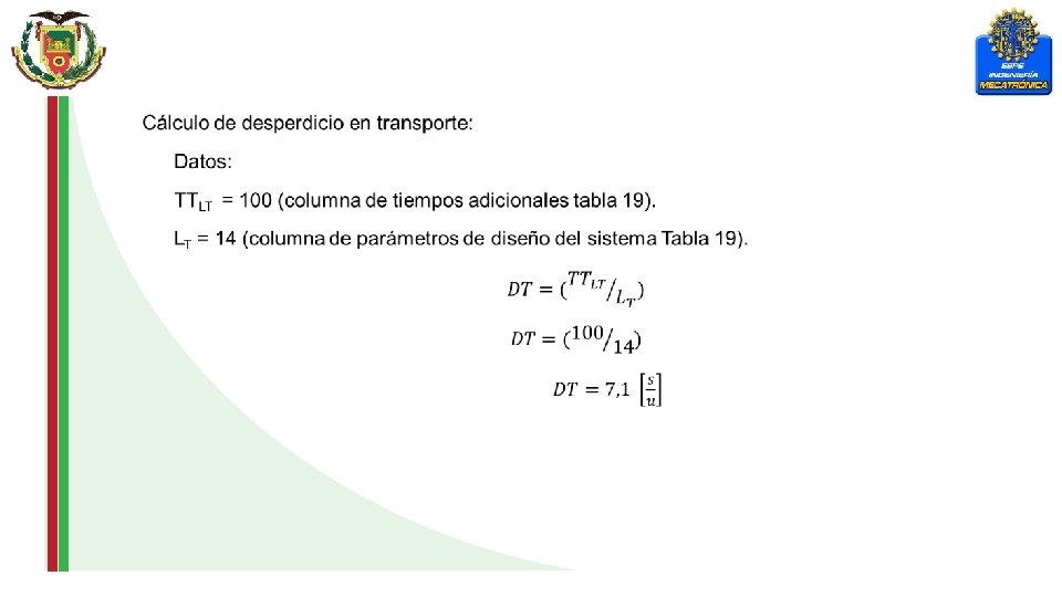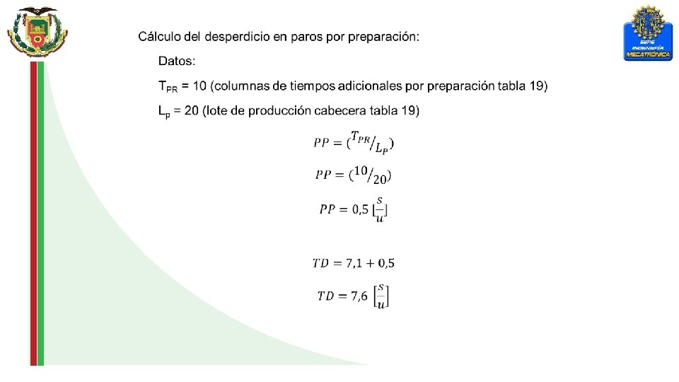 Desperdicio por rechazos (DR): El tiempo de desperdicio TD: Dónde: DT = Desperdicio en transporte. PP = Paros por preparación.