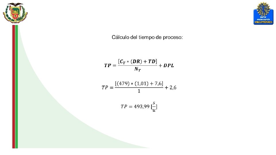 Tiempo de ciclo: Dónde: C: Tiempo de ciclo por unidad de producto: de persona o máquina. TVA = Tiempo de valor agregado. TNVA = Tiempo de no valor agregado (parámetro de ajuste) TL = Tiempo de proceso máquina. TPNP = Tiempo de paros no programados. (Parámetro de ajuste).