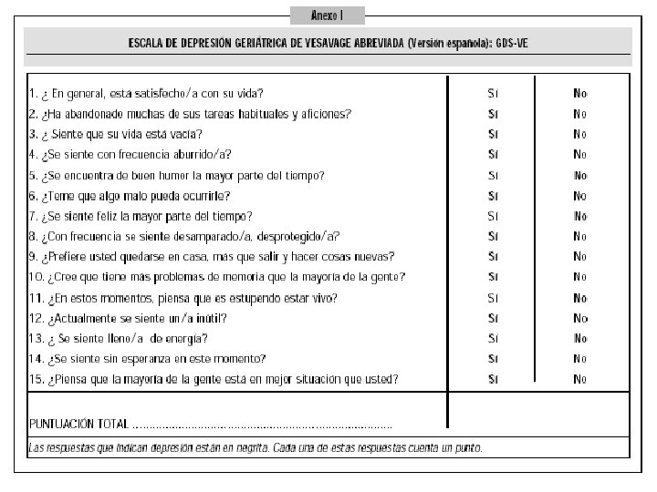 EVALUACIÓN DE LA ESFERA EMOCIONAL y SOCIAL identificar problemas como: Depresión Abuso de Alcohol Red Familiar y Social pobres