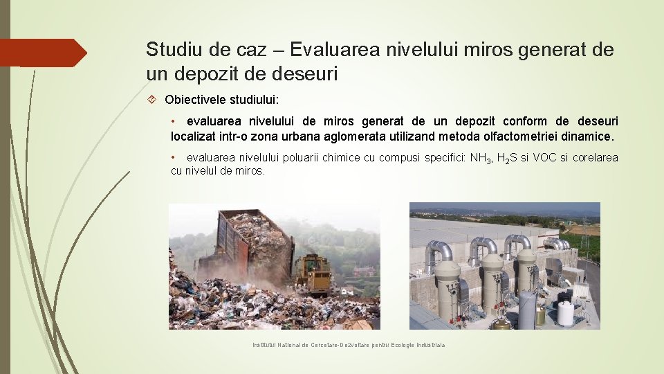 Studiu de caz – Evaluarea nivelului miros generat de un depozit de deseuri Obiectivele studiului: • evaluarea nivelului de miros generat de un depozit conform de deseuri localizat intr-o zona urbana aglomerata utilizand metoda olfactometriei dinamice. • evaluarea nivelului poluarii chimice cu compusi specifici: NH 3, H 2 S si VOC si corelarea cu nivelul de miros. Institutul National de Cercetare-Dezvoltare pentru Ecologie Industriala