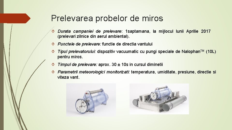 Prelevarea probelor de miros Durata campaniei de prelevare: 1 saptamana, la mijlocul lunii Aprilie 2017 (prelevari zilnice din aerul ambiental). Punctele de prelevare: functie de directia vantului Tipul prelevatorului: dispozitiv vacuumatic cu pungi speciale de Nalophan. TM (10 L) pentru miros. Timpul de prelevare: aprox. 30 ± 10 s in cursul diminetii Parametrii meteorologici monitorizati: temperatura, umiditate, presiune, directie si viteza vant.