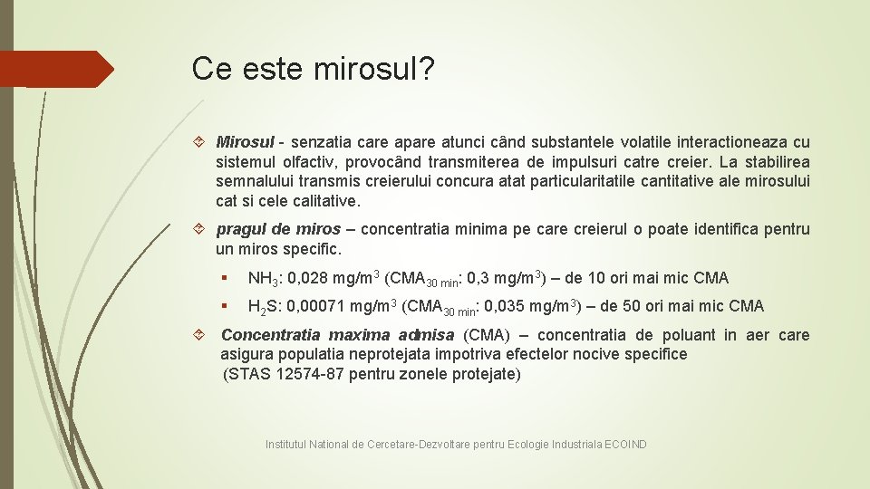 Ce este mirosul? Mirosul - senzatia care apare atunci când substantele volatile interactioneaza cu sistemul olfactiv, provocând transmiterea de impulsuri catre creier. La stabilirea semnalului transmis creierului concura atat particularitatile cantitative ale mirosului cat si cele calitative. pragul de miros – concentratia minima pe care creierul o poate identifica pentru un miros specific. § NH 3: 0, 028 mg/m 3 (CMA 30 min: 0, 3 mg/m 3) – de 10 ori mai mic CMA § H 2 S: 0, 00071 mg/m 3 (CMA 30 min: 0, 035 mg/m 3) – de 50 ori mai mic CMA Concentratia maxima admisa (CMA) – concentratia de poluant in aer care asigura populatia neprotejata impotriva efectelor nocive specifice (STAS 12574 -87 pentru zonele protejate) Institutul National de Cercetare-Dezvoltare pentru Ecologie Industriala ECOIND