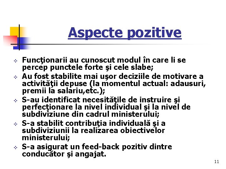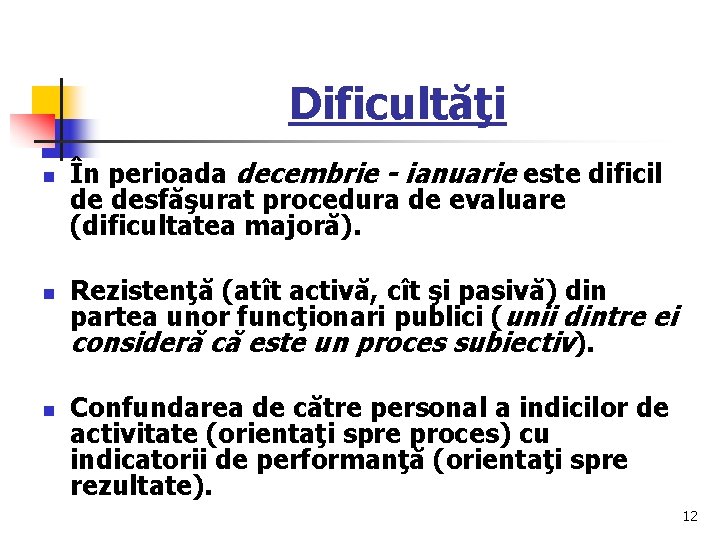 Aspecte pozitive v v v Funcţionarii au cunoscut modul în care li se percep punctele forte şi cele slabe; Au fost stabilite mai uşor deciziile de motivare a activităţii depuse (la momentul actual: adausuri, premii la salariu, etc. ); S-au identificat necesităţile de instruire şi perfecţionare la nivel individual şi la nivel de subdiviziune din cadrul ministerului; S-a stabilit contribuţia individuală şi a subdiviziunii la realizarea obiectivelor ministerului; S-a asigurat un feed-back pozitiv dintre conducător şi angajat. 11