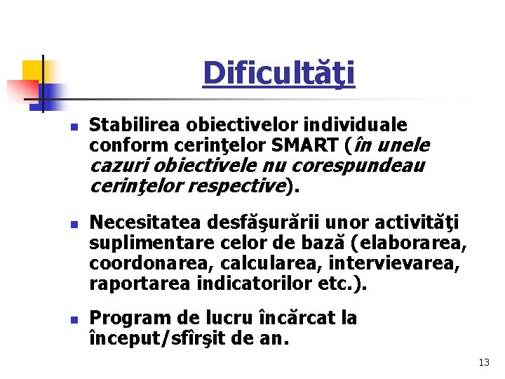 Dificultăţi n n n În perioada decembrie - ianuarie este dificil de desfăşurat procedura de evaluare (dificultatea majoră). Rezistenţă (atît activă, cît şi pasivă) din partea unor funcţionari publici (unii dintre ei consideră că este un proces subiectiv). Confundarea de către personal a indicilor de activitate (orientaţi spre proces) cu indicatorii de performanţă (orientaţi spre rezultate). 12