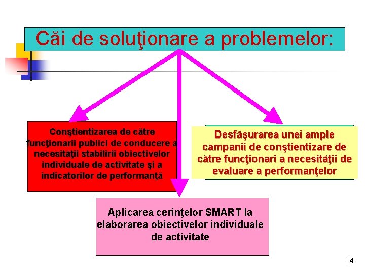 Căi de soluţionare a problemelor: Conştientizarea de către funcţionarii publici de conducere a necesităţii stabilirii obiectivelor individuale de activitate şi a indicatorilor de performanţă Desfăşurarea unei ample campanii de conştientizare de către funcţionari a necesităţii de evaluare a performanţelor Aplicarea cerinţelor SMART la elaborarea obiectivelor individuale de activitate 14