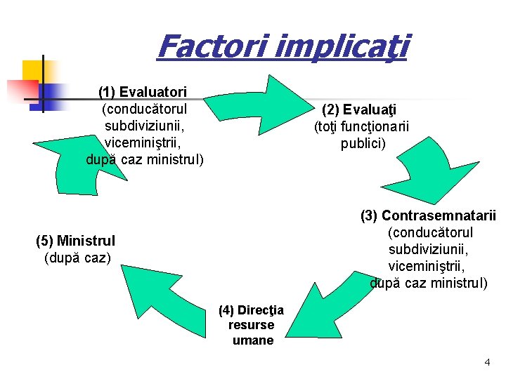 Factori implicaţi (1) Evaluatori (conducătorul subdiviziunii, viceminiştrii, după caz ministrul) (2) Evaluaţi (toţi funcţionarii publici) (3) Contrasemnatarii (conducătorul subdiviziunii, viceminiştrii, după caz ministrul) (5) Ministrul (după caz) (4) Direcţia resurse umane 4