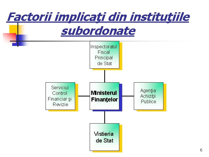 Factorii implicaţi din instituţiile subordonate Inspectoratul Fiscal Principal de Stat Serviciul Control Financiar şi Revizie Ministerul Finanţelor Agenţia Achiziţii Publice Vistieria de Stat 6