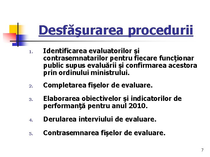 Desfăşurarea procedurii 1. 2. 3. Identificarea evaluatorilor şi contrasemnatarilor pentru fiecare funcţionar public supus evaluării şi confirmarea acestora prin ordinului ministrului. Completarea fişelor de evaluare. Elaborarea obiectivelor şi indicatorilor de performanţă pentru anul 2010. 4. Derularea interviului de evaluare. 5. Contrasemnarea fişelor de evaluare. 7