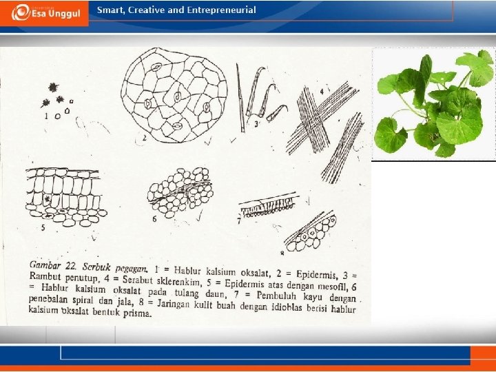 Makroskopik, mikroskopik • Cara ini di lakukan terhadap bahan obat di mulai 1847: C. A. Seydler memeriksa Sarsaparilla. • Pemeriksaan meliputi mikroskopik – Untuk mengetahui adanya jenis pengotoran/pemalsuan, misal : Orthosiphonis Folia biasanya di campur Eupatorini Folia. – Untuk mengetahui kemurnian serbuk bahan obat – Untuk mengetahui mikrophologi/histologi dari suatu bagian tumbuhan. • Prinsip pemeriksaan : bahwa untuk bagian tertentu dari suatu species atau varietas mempunyai ciri khas.
