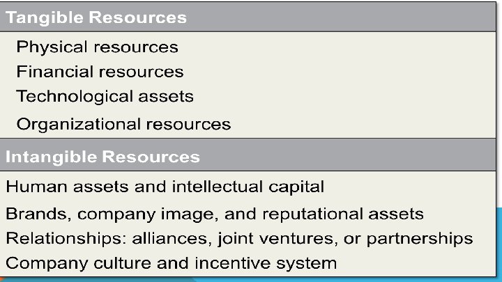 • CAPABILITY CAPACITY OF A FIRM TO PERFORM A CERTAIN INTERNAL ACTIVITY COMPETENTLY. • RESOURCE A PRODUCTIVE INPUT THAT IS OWNED OR CONTROLLED BY THE FIRM. Ø TANGIBLE Ø INTANGIBLE