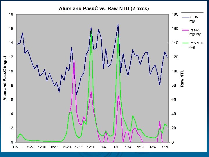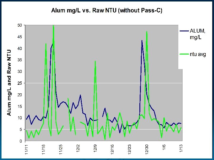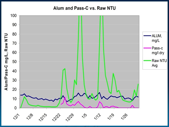 City of Lake Oswego Field Results Ø The use of Pass-C at 3 to 11 mg/L decreases Alum use by up to (75%)* during periods of high raw water turbidity. Ø The use of Pass-C at high turbidity prevents the need for Operators to additional alkalinity. Ø Improves ease of operation Ø Cost differences appear to be nominal * Rough number