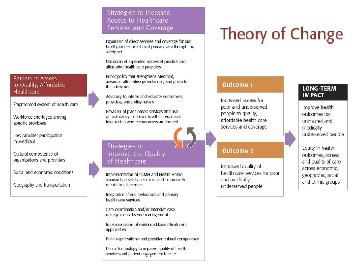 Theory of Change A good TOC tells you. . . what impacts we seek through our investments in your work what outcomes are necessary to attain the desired impact, and which strategies are theorized to bring about positive change in outcomes