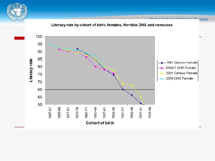 Cohort approach q Use the demographic concept of birth cohort to generate time series data for people who were born in the same year/period by their completed level of education and literacy q Analyze successive census data by cohorts - if they show the same or similar number/percentage for certain level of education while age increases q Assumptions: n n Population size changes with births and deaths only – no migration People do not continue education after reaching certain age - based on educational system in a country