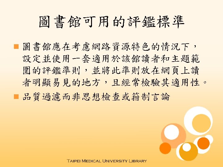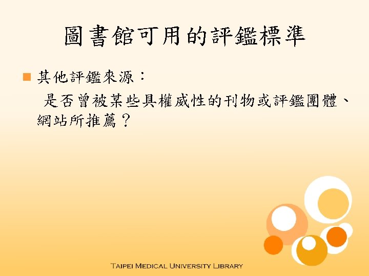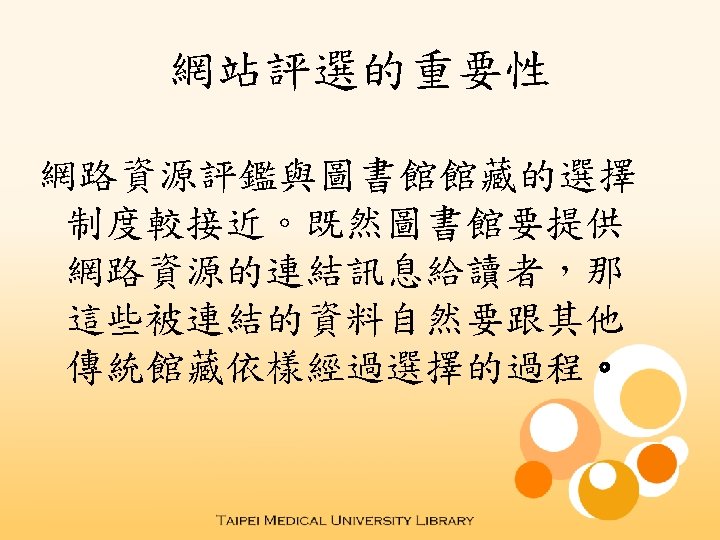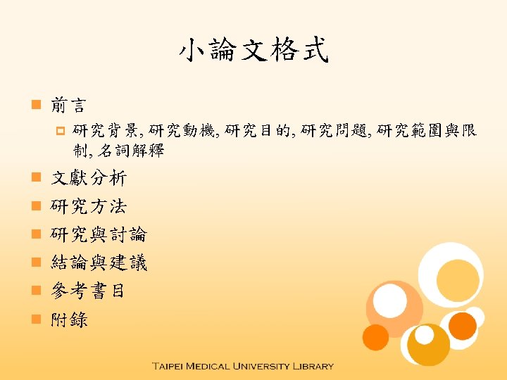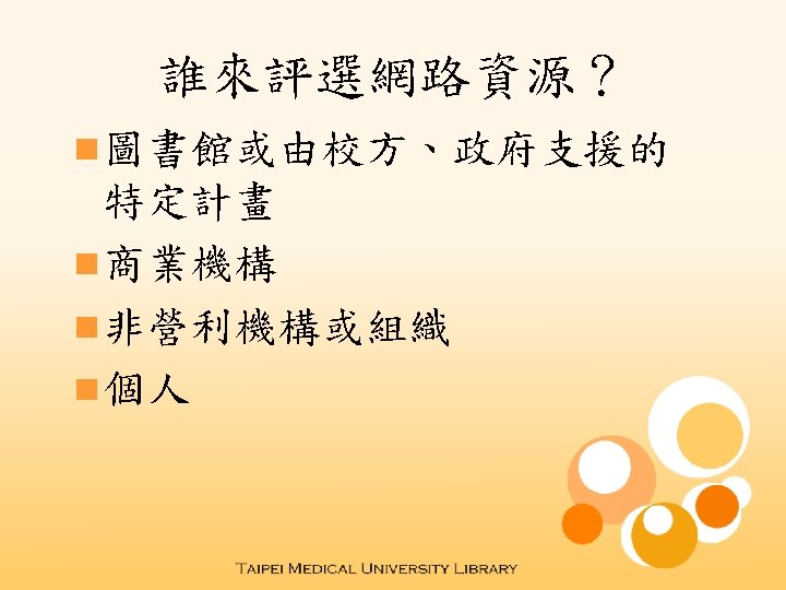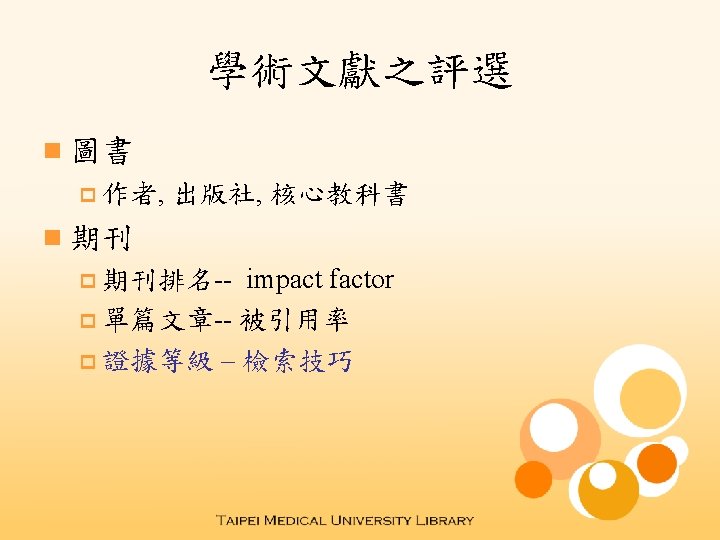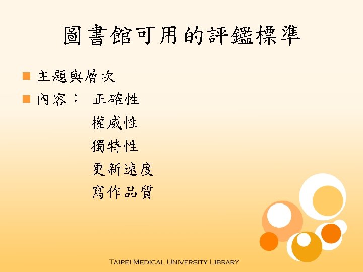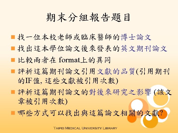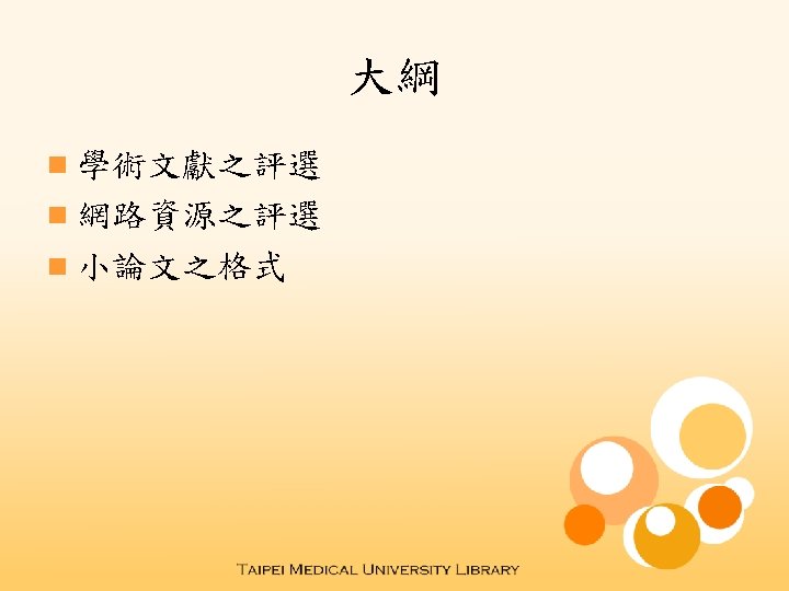 資訊的評選與呈現 小論文之選材與格式 Evaluation and Presentation of Information 邱子恆 tzchiu@tmu. edu. tw 臺北醫學大學通識教育中心 2011. 05. 02
