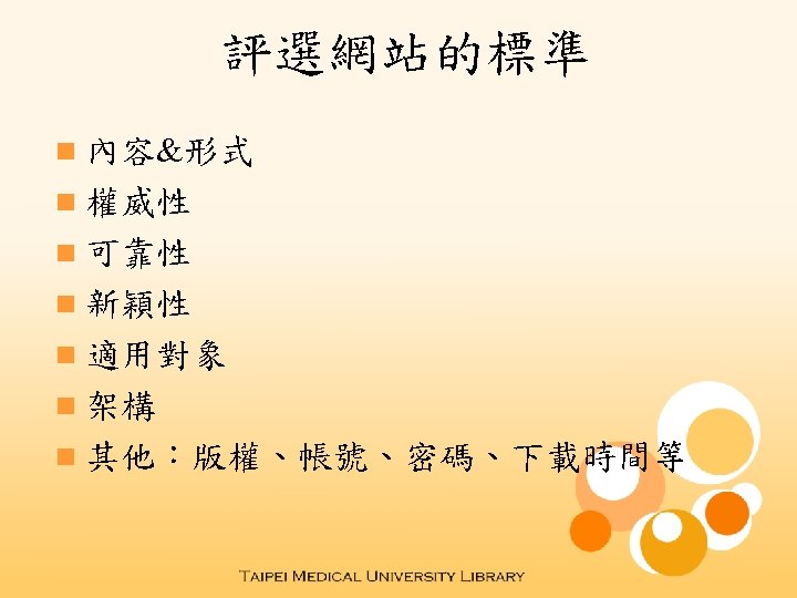 評鑑網站的標準 n Content and Organization 1. Unique, original content 2. Up-to-date content 3. Well-organized content 4. Are graphics content?