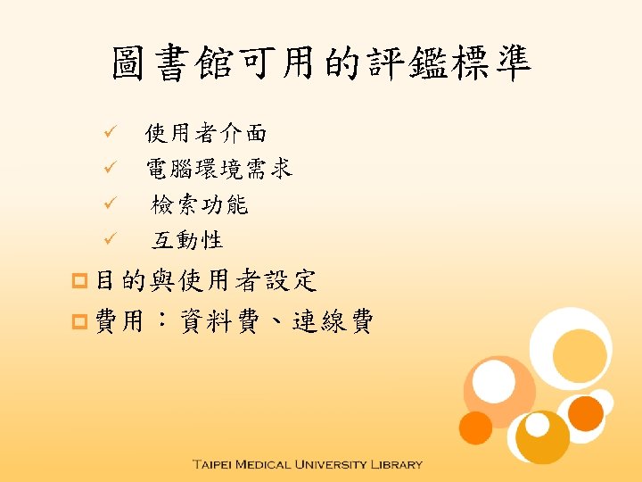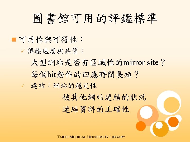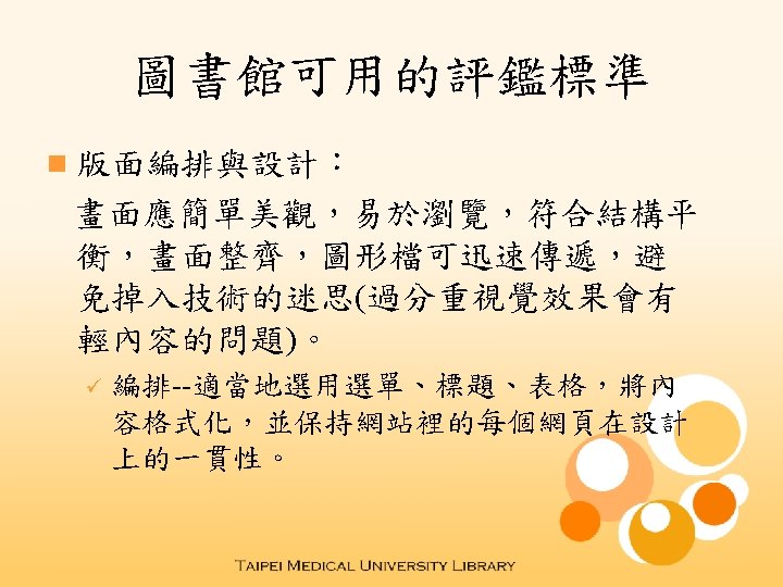 評鑑網站的標準 n Presentation and Usability 1. Easy to learn 2. Efficient to use 3. Easy to remember 4. Few errors 5. Pleasant to use