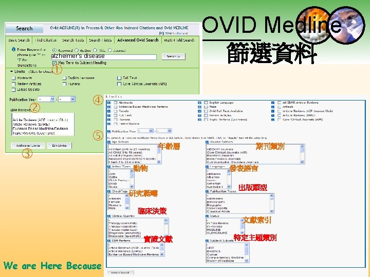 Ovid Medline EBM 文獻 查詢順位 1. Systematic Review Cochrane System Review Health Technology Assessments ACP Journal club Meta-Analysis Consensus Development Reports Decision Analyses Guideline/Practice Guideline – – – – ----Clinical Queries---- -- • RCTs Double Blind studies (therapy, diagnosis) – • Controlled Clinical Trials – 1. Multicenter Studies Crossover Design We are Here Because of You! 4. Cohorts Studies (prognosis, etiology, prevention) – Longitudinal Studies • • Follow-Up Studies Prospective Studies 5. Case Control Studies (prognosis, etiology, prevention) – Retrospective Studies • • • Cross-Sectional Survey Review Case Series/Case Reports • 使用Limits/Additional Limits篩選,例如 RCTs • 研究方法可使用Map Term to Subject 47 Heading查詢,如Cohorts Studies