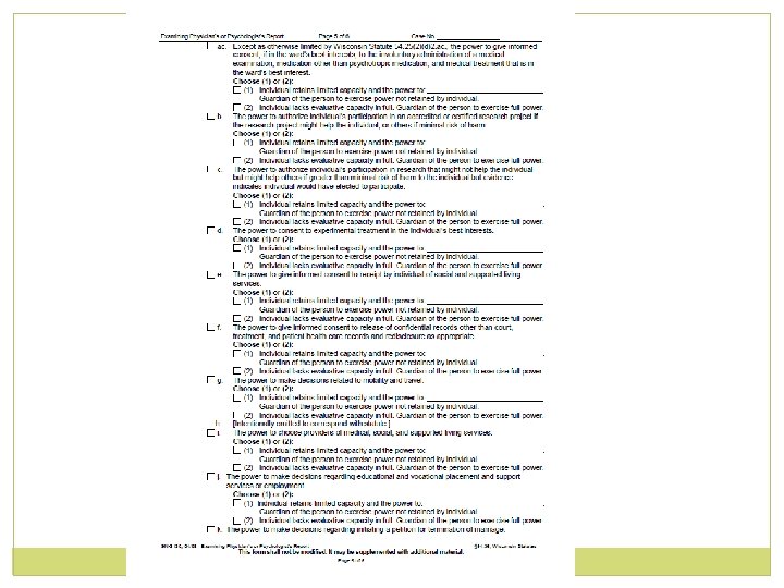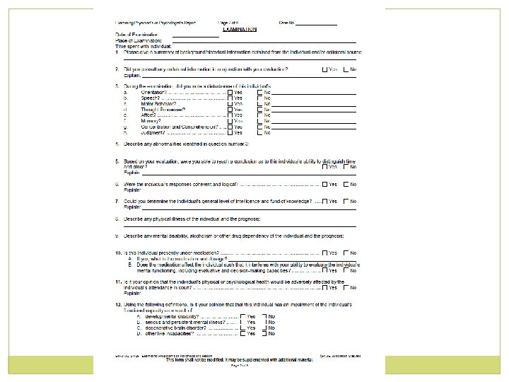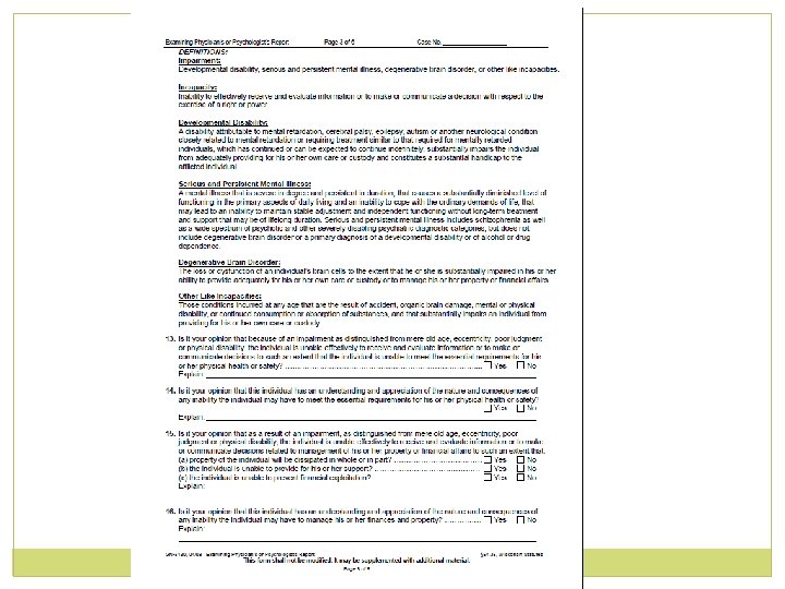 Caveats o Presence of any of these diagnoses/conditions in and of itself is not considered a basis for a finding of incompetency o It is the resulting deficit in capacity that serves as this basis