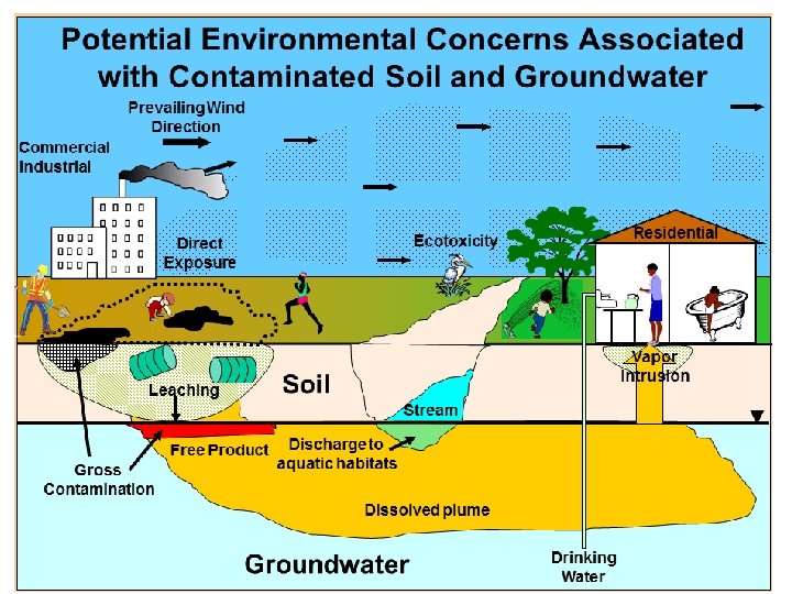 Environmental Hazards Gross Contamination Human Health Terrestrial Habitats INDOOR AIR Vapor Intrusion Direct Exposure SOIL GAS Leaching Aquatic Habitats GROUNDWATER Gross Contamination Human Health Vapor Intrusion Drinking Water (toxicity)