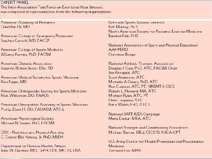 Disclaimer • “Certified athletic trainers work in a variety of professional and geographic settings…. . obviously the ATC in Florida will adapt the recommendations to his or her environment, while the ATC in Maine will make different adjustments. ” - Casa • “Athletic trainers should recognize that temperature ranges might vary widely based upon geographic regions. Athletic trainers may practice in regions, such as the southeastern United States, where the WBGT is routinely in the high or extreme or hazardous level of risk throughout a significant part of the year. In these regions, while it may not be practical to reschedule or delay events, the athletic trainer must recognize that the level of risk is high and take appropriate steps to reduce risk. ” – NATA
