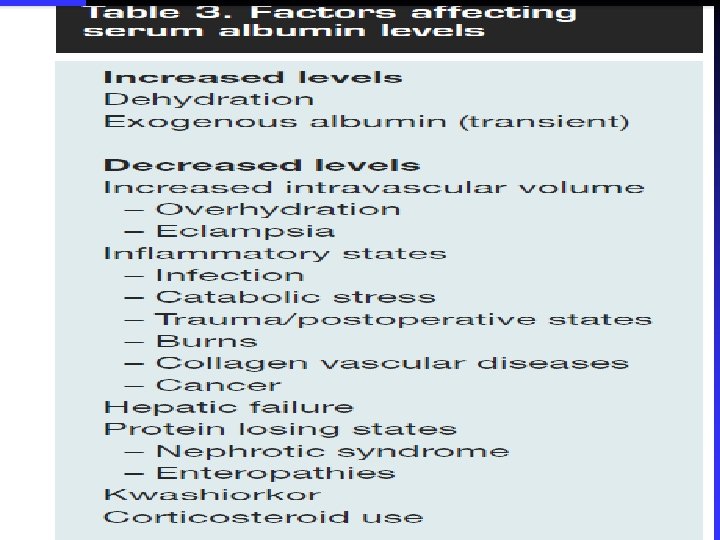 Visceral Proteins: Serum Albumin • • • Reference range: 3. 5 -5. 2 g/dl Abundant in serum, stable (half-life 3 weeks) Preserved in the presence of starvation (marasmus) • Negative acute phase reactant (declines with the inflammatory process) • Large extravascular pool (leaves and returns to the circulation, making levels difficult to interpret) • Therefore, albumin is a mediocre indicator of nutritional status, but a very good predictor of morbidity and mortality