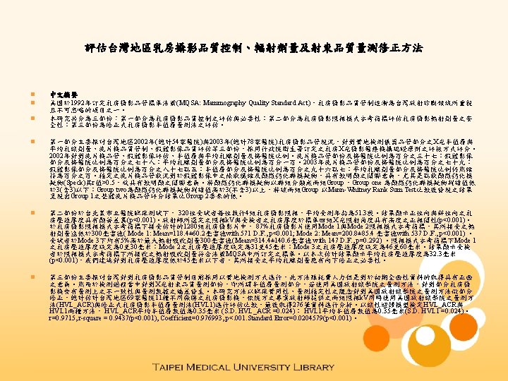 EVALUATION OF MAMMOGRAPHY QUALITY CONTROL, RADIATION DOSE AND MODIFIED X-RAY BEAM QUALITY ASSESSMENT IN TAIWAN n n 英文摘要 Taiwan governments started overall screening mammography on 2004. The policy of screening mammogram has announced by Department of Health, Executive Yuan, Taiwan, and start on July, 2004. Breast radiation dose is the most important issue when starting screening mammography. Through this study we would like to know that the situation and understand why they need to accessed these quality control tests, younger women’s radiation dose, radiation dose per mammogram, significance in different compressed breast thickness, And finally we modified Halve value layer measured procedure. n The study was devided three parts: Estimation and Imperative of Mammography Quality Control, Mammography Radiation Dose Safety By the Evaluation of Exposure Setting Parameters and Evaluation of X-Ray Beam Quality (HVL) Analogous Assessment in Mammography. n The first study, we estimated the mammography processor quality control data and facilities proformance such as HVL and Average Glandular Dose on 2002 and 2003. The results showed that the phantom image was improved through mammography quality control project. And there is highly significant between processor quality and speck groups. n The second study, 320 subjects are participanted, every subject takes 4 exposure views(mammograms). Average estimated age is 51. 3 years old. There is a significant difference of compressed breast thickness (p<0. 001) between Cranio Caudal view and Medio Lateral Oblique view. The results also show 87% mammograms have significantly lower absorbed radiation dose compared with 300 mrad when breast compressed thickness below 45 mm( Mode 1: Mean=118. 4± 60. 2 mrad with 571 D. F. , p<0. 001; Mode 2: Mean=200. 8± 85. 4 mrad with 537 D. F. , p<0. 001). About 5% estimated mammograms result in higher absorbed radiation dose (>300 mrad) when breast thickness between 46 mm to 60 mm (Mode 3: Mean=314. 4± 140. 6 mrad with 147 D. F. , p=0. 292). n The third study, we used more standard and easier procedure (named HVL 1) to assess mammography x-ray beam quality. Prospectively compare HVL 1 with standard ACR procedures (named HVL_ACR) for Halve Value Layer estimation in all mammographic units. Total 11 mammographic brands, 69 hospitals, and 276 estimated HVL data are evaluated in our study. Each hospital selected two most commonly used clinical k. Vp. Both HVL 1 and HVL_ACR are evaluated at each k. Vp. 70. 3% estimated data chose 25 k. Vp and 26 k. Vp settings. HVL 1 procedure gets the same result in compared with HVL_ACR procedure. It shows a positive relationship between HVL 1 and HVL_ACR (r= 0. 9715, R-Square = 0. 9437, p<0. 001). For GE, Toshiba, and Instrumentarium mammographic units, there are no significant difference between HVL_AVR and HVL 1 (t = 1. 63197, 1. 83557, and 2. 90656 respectively ( p >0. 001) ). Furthermore, HVL 1 had better results on photon energy reproducibility (Regression between E 0 a and E 0 b, where r=0. 9935(ACR mode), r=0. 9969(HVL 1 mode), p<0. 001). With this new procedure of HVL measurement, we get the same and accurate data as the standard procedure provided by ACR mammography QC manual.