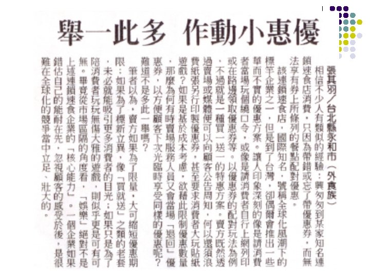 報紙產業現況 l l l 報紙產業現況 Newspaper readership has been declining for years, although it remains a fairly healthy advertising medium. Market selectivity l l The ability to target specific consumer group E. g. special interest newspapers, special interest sections, and advertising inserts delivered only to particular zip codes or zones.
